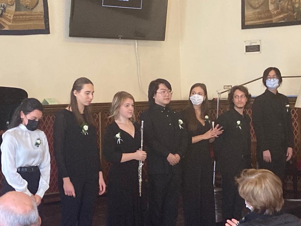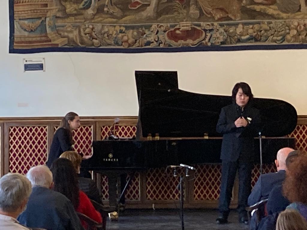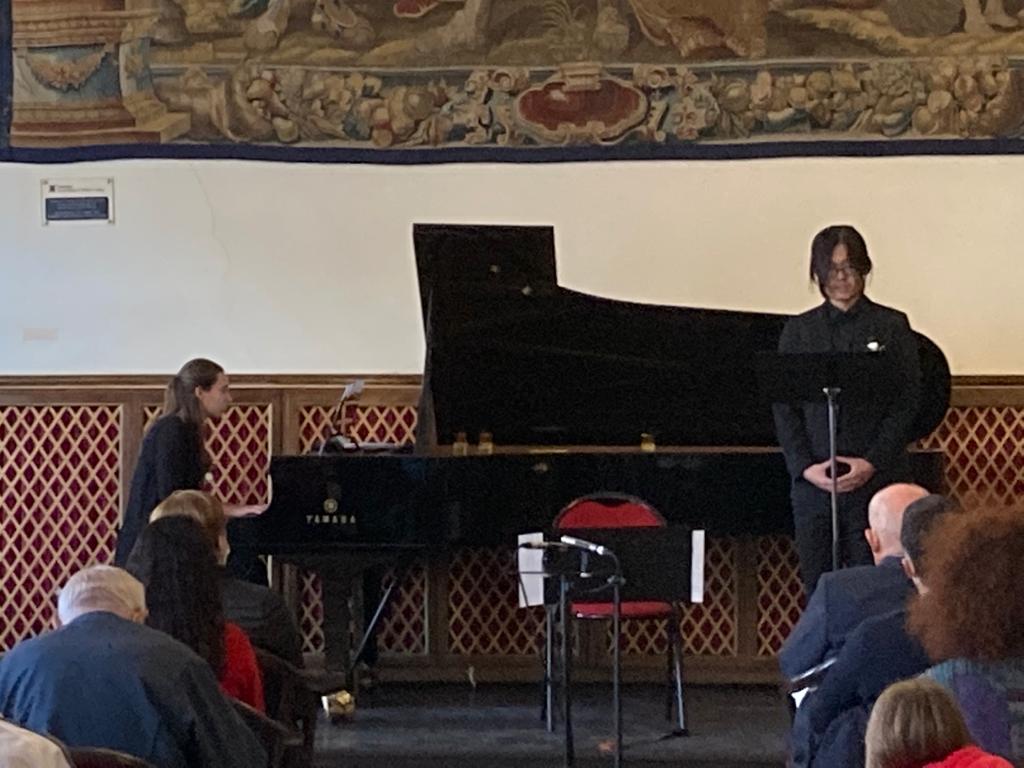 In apertura dell’evento gli interpreti del concerto, lo staff sicurezza del Conservatorio e i docenti di Musica da camera Anna Bellagamba e Giuseppe Fagnocchi si sono presentati al pubblico con un fiore bianco al petto per ricordare la recentissima scomparsa, a seguito di tragico incidente stradale, dello studente cinese Liu Guozhi, baritono iscritto al corso accademico di Musica vocale da camera. Di lui sono state brevemente ricordate la generosità, le principali attività svolte per il Conservatorio, e alcuni aspetti del programma incentrato proprio su profonde riflessioni dedicate alla morte e alla speranza di una pace eterna come recitava il testo del Lied schubertiano “Il tiglio” (der Lindenbaum) che Liu Guozhi aveva eseguito e chi di lì a poco sarebbe risuonato in sala.