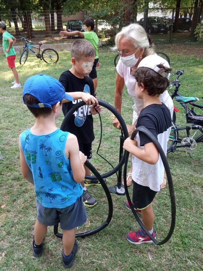 Infine, con il terzo incontro, volontari e bambini si “sporcati le mani” riparando camere d’aria bucate e percorrendo un piccolo e divertente percorso, creato appositamente, ricco di segnaletica, preludio a quello che sarà l’evento FIAB “Bimbimbici” del prossimo 11 ottobre.