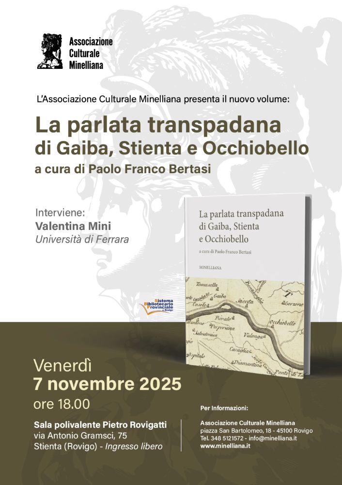 Stienta (RO) – C’è un patrimonio che non si misura in monumenti o archivi, ma nelle parole che ogni giorno hanno dato voce alla vita di una comunità. È da questa consapevolezza che nasce “La parlata transpadana di Gaiba, Stienta e Occhiobello”, il nuovo volume curato da Paolo Franco Bertasi e pubblicato da Edizioni Minelliana, che sarà presentato venerdì 7 novembre 2025, alle ore 18.00, nella Sala Polivalente “Pietro Rovigatti” di Stienta.