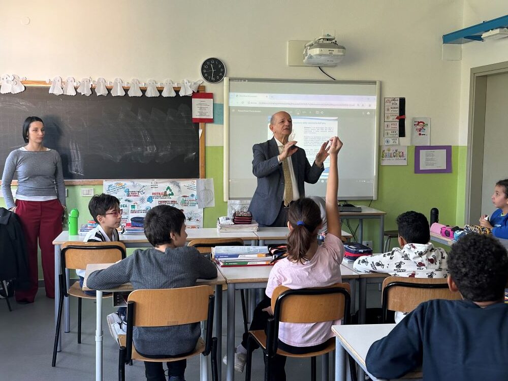 A passeggiare tra i banchi per conversare con gli alunni della classe 5^ A sul tema “Risparmio e uso consapevole e responsabile del denaro”, sono intervenuti: Camilla Ferrazzi, Valentina Toscan e Bruno Candita.