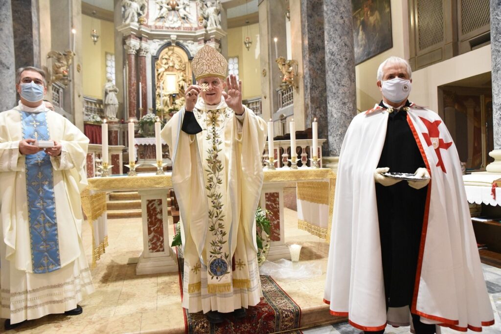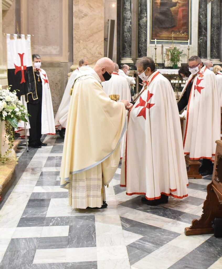 Durante la Cerimonia, il Priorato delle Tre Venezie per suggellare il particolare rapporto che lega i Cavalieri, le Dame e i Novizi alla Vergine del Pilastrello ha donato alla Basilica, la croce patente in oro, il simbolo del Priorato fatta costruire per la particolare occasione.