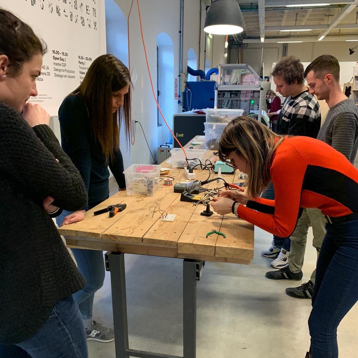 Dopo un giro per esplorare il laboratorio è arrivata l’ora di iniziare le lezioni, seguendo la guida del personale tecnico specializzato. I partecipanti si sono immersi nel mondo di ‘Arduino’. Con questo strumento si possono realizzare, in maniera relativamente rapida e semplice, piccoli dispositivi come controllori di luci, di velocità per motori, sensori di luce, automatismi per il controllo della temperatura e dell’umidità e molti altri progetti. Priorità di questa prima giornata di corso è stata quella di far lavorare in gruppo i ragazzi, coinvolgendoli attraverso una collaborazione attiva in un ambiente differente rispetto a quello quotidiano. Farli uscire dalla loro comfort zone ed entrare in contatto con una realtà che potrebbe sembrare lontana, ma capendone la versatilità tanto da poter risultare utile anche nella loro azienda agricola.