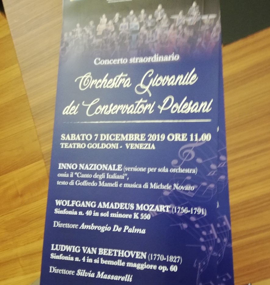 Venezia, nel prestigioso Teatro Goldoni, accoglierà sabato 7 dicembre alle 11.00, il primo dei tre concerti, in collaborazione con la Regione Veneto e la Direzione generale dell’URS. Il programma comprende le Sinfonie n. 40 di Mozart e n. 4 di Beethoven che saranno proposte a una platea di studenti. Ambrogio De Palma e Silvia Massarelli guideranno il concerto, occasione di auguri per le festività ma anche di vicinanza a Venezia messa a dura prova dagli ultimi disastri naturali.