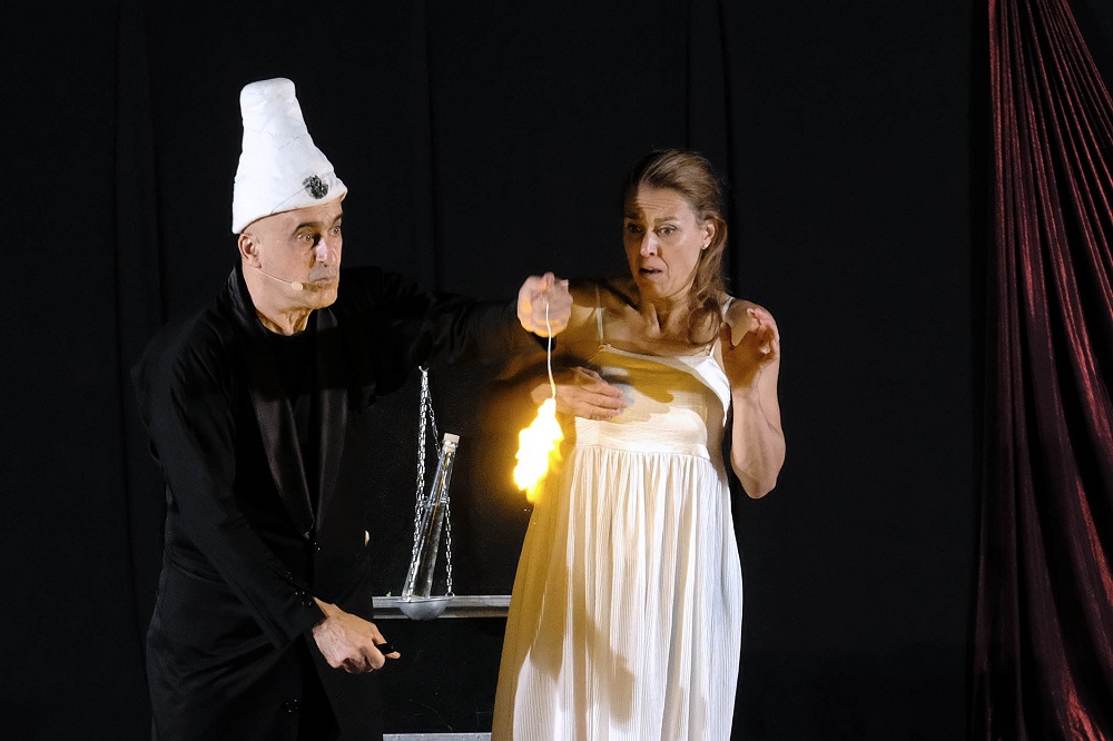 Un susseguirsi di numeri in cui i due artisti, abruzzese lui, studioso e ricercatore dell’arte della comicità; argentina lei, statuario e possente fisico da acrobata circense, che sa reggersi su una sola mano, si sono alternati come meravigliosi protagonisti di performance applauditissime e coinvolgenti. Dalla nuvola dei petali di rosa alla nevicata estiva, elogio della bellezza e della perfezione fisica, con cui la Corbo (ten-donna anziché donna-tendone, da circo) si muoveva sui trampoli, piegava il corpo e si sorreggeva in pose prodigiose e apparentemente così naturali. Ma, si sa: “La realtà è un punto di vista, lo diceva Polifemo…”. Il Mago della Maiella, personaggio di punta di Lannutti, “spacciatore di buonumore”, che opera la trasmigrazione della materia, pratica una magia filosofica: “La vita è il più grande mago che si prende gioco di noi”, ha detto. D’altra parte: “Chieti e ti sarà dato!”. Assolutamente nuovo, surreale, sconcertante ed esilarante la promozione dell’utensile telecomandato “Saverio, l’oggetto del desiderio”: una testa parlante (quella di Lannutti), indispensabile a tutti, uomini e donne. Ti indica il parcheggio, ti fa i complimenti antidepressivi e… mille altre azioni tra il geniale e l’assurdo.