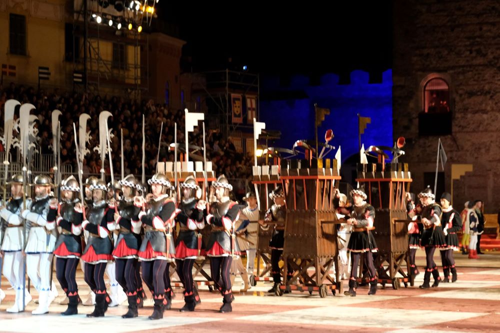 Poi, scesero in lizza arcieri, alabardieri, fanti schiavoni e cavalieri e tennero una mostra in campo agli ordini del comandante del Castello. Anche i Vessilliferi dei Borghi esibirono la loro bravura con un lancio di bandiere; infine entrarono nel campo di gara i meravigliosi pezzi bianchi e neri con re e regine, torri e cavalieri, alfieri e pedoni.