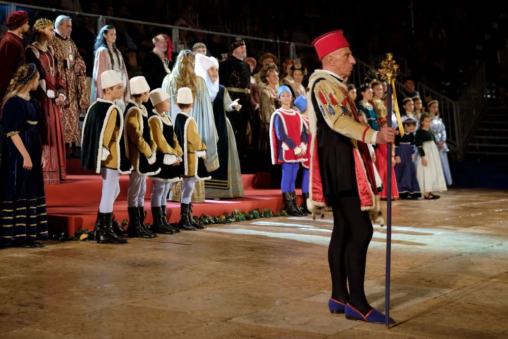 Oggi come allora l’emozione si rinnova, in una fastosa cornice di costumi preziosi e di gonfaloni, affascinanti dame ed intrepidi cavalieri, scherzose maschere della Commedia dell’Arte, giocolieri, rinnovando negli animi il sapore antico di una appassionante storia d’amore.