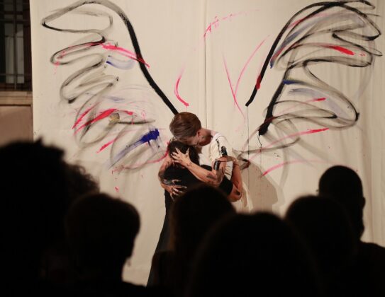 Al secondo posto, L’inchiostro e l’abbraccio, di e con Angela Ameli e Giada Fedeli-Gammaphi, per la regia di Marco Gistri, una produzione di compagnia Minimal di Pomarance. A partire dalle parole di Natalia Ginzburg “il guaio delle donne è che ogni tanto hanno l’abitudine di cadere in un pozzo e soffrire prima di riuscire a risalire: tuttavia non è importante sapere tutto, ma riuscire a riemergere”, si è rivelata la performance, utilizzando anche mezzi originali, ovvero pannelli bianchi e tele dipinte dall’inchiostro, nelle quali si è manifestata la grandezza dell’animo femminile, avvolto poi in un abbraccio.