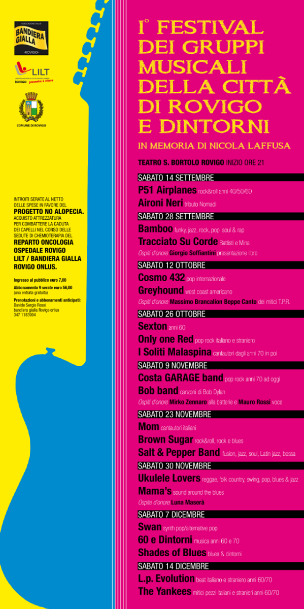 ROVIGO – La musica abbraccia la solidarietà. Bandiera Gialla e Lilt insieme con un evento a beneficio della comunità. Il 14 settembre prenderà il via il primo Festival dei gruppi musicali della città di Rovigo e dintorni. Nove serate al teatro San Bortolo per divertirsi e fare del bene.
