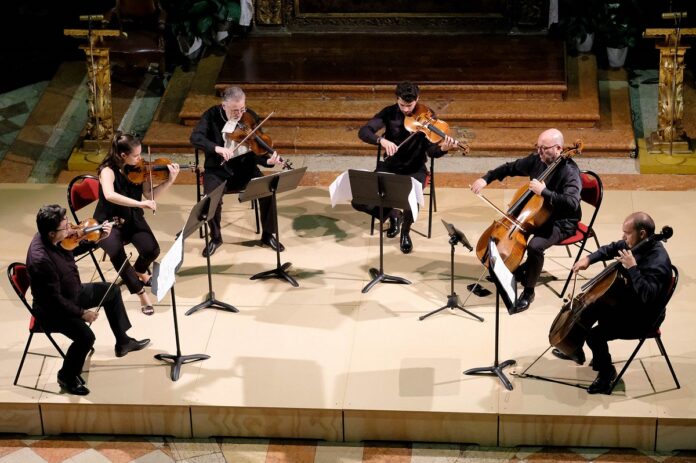 ROVIGO – Si aggiunge al crescendo di successi di Rovigo Cello City lo splendido concerto che si è tenuto venerdì 4 settembre alle ore 21 presso il Tempio della Rotonda, nel quale un meraviglioso sestetto composto da maestri di fama internazionale ha regalato al pubblico un concerto davvero memorabile. Un’occasione preziosa e rara anche di ascoltare un autentico violino Stradivari, suonato dal primo violino del sestetto Klaidi Sahatçi, konzertmeister della Tonhalle Orchester di Zurigo, uno strumento di valore inestimabile del celebre liutaio cremonese, appartenuto nell’Ottocento al violinista e compositore polacco Henri Wieniawski.