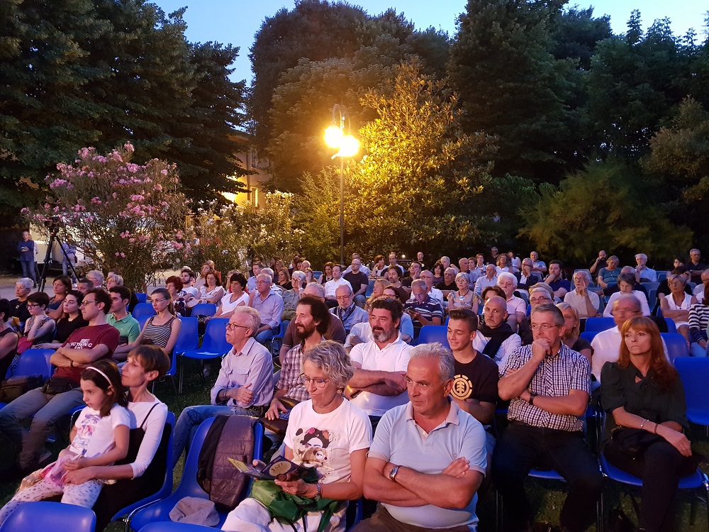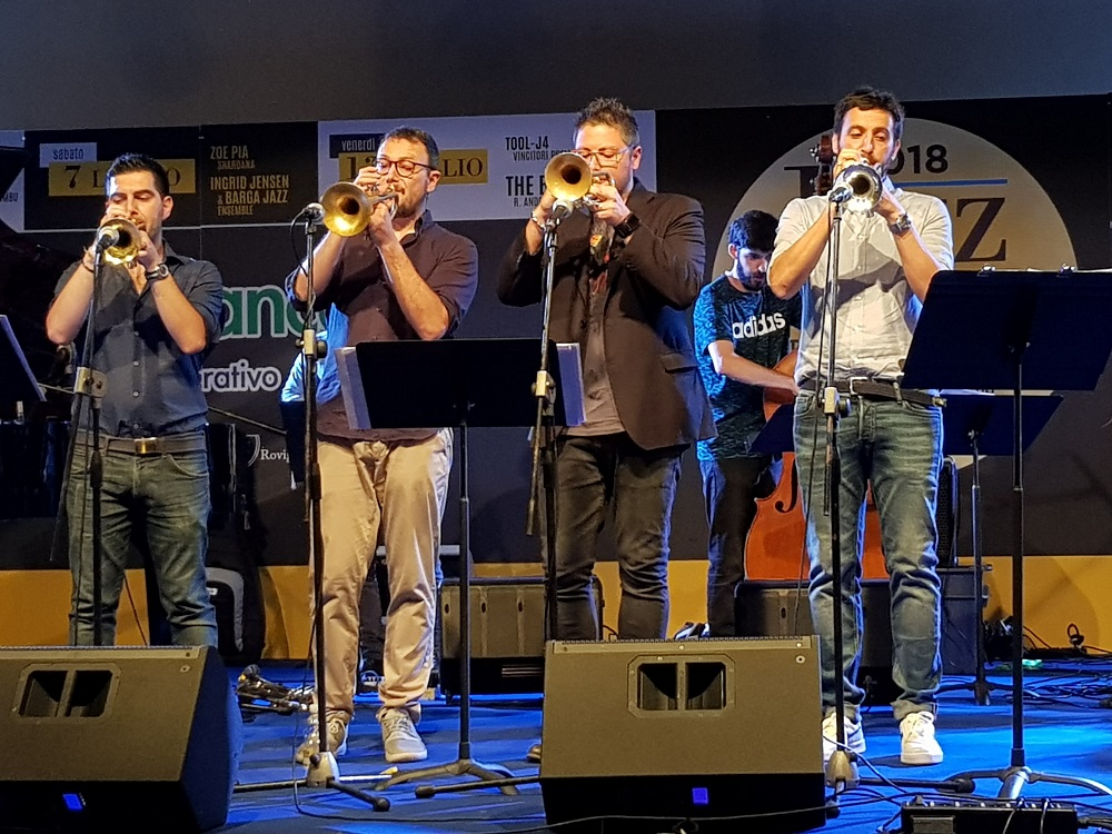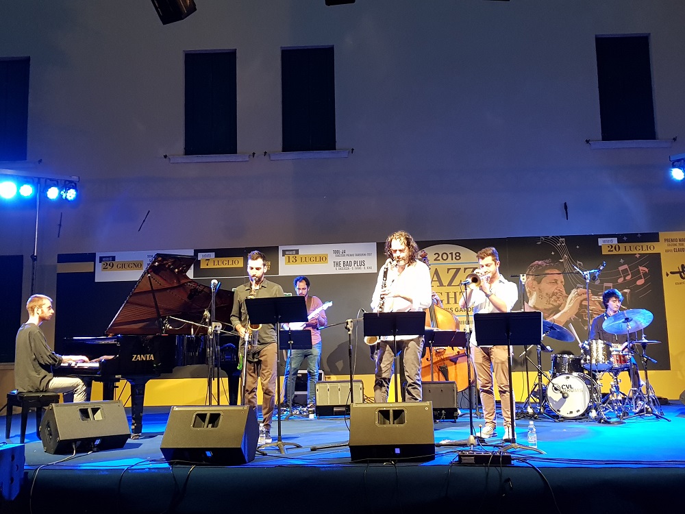 Dopo i saluti iniziali di Stefano Onorati, direttore artistico della manifestazione, e di Lorenzo Liviero, presente sul palco nella duplice veste di presidente dell’istituto di credito cooperativo rodigino e del Conservatorio di Musica, è toccato al Siena Jazz Ensemble inaugurare la serata. Il settetto, guidato da Achille Succi, clarinetto basso, era formato da Jacopo Fagioli, tromba, Bruno Governatori, chitarra, Marco Benedetti, contrabbasso, Simone Brilli, batteria, più due sorprese non annunciate, Manuel Caliumi, alto sassofonista del Conservatorio rodigino al posto dell’annunciata cantante Lia Ferro, e il pianista Giovanni Venturini, studente del Conservatorio senese. Il gruppo, che ha concluso con il concerto nel giardino Casalini un seminario di tre giorni organizzato nell’ambito di un collaudato interscambio didattico fra i Conservatori di Siena e Rovigo, entrambe eccellenze della didattica jazzistica italiana, ha presentato un arrangiamento di un brano di Horace Silver, e tre composizioni originali di Succi, Fagioli e Benedetti.
