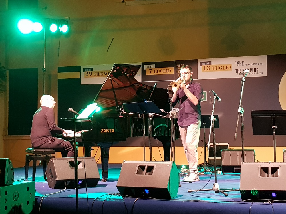Dopo l’applaudita esibizione dell’ensemble senese l’atmosfera si è improvvisamente rarefatta, per toccare momenti di grande intensità con la riuscita esibizione del duo formato dal pianista Stefano Onorati e dal trombettista Fulvio Sigurtà, entrambi docenti del Venezze. Un concerto davvero “senza rete” quello del duo in cui, come ha tenuto a precisare Onorati in sede di presentazione, «non conta quello che abbiamo scelto di suonare, ma come lo suoneremo». Per la cronaca sono stati scelti come canovaccio su cui improvvisare un brano di Richie Beirach e uno di John Taylor, entrambi pianisti, ma la musica è subito scivolata su binari molto liberi, in cui più che i riferimenti armonici delle composizioni prescelte contava lo stretto dialogo intrecciato fra Sigurtà e Onorati, non solo eccellenti strumentisti ma musicisti completi, parsi davvero in serata di grazia, che hanno regalato forti emozioni a un pubblico che ha seguito quasi in religioso silenzio la loro toccante performance. La dimostrazione, se mai ce ne fosse bisogno, che quando ci sono il giusto interplay e una sincera urgenza espressiva anche la musica più libera, apparentemente difficile, riesce a coinvolgere gli ascoltatori.