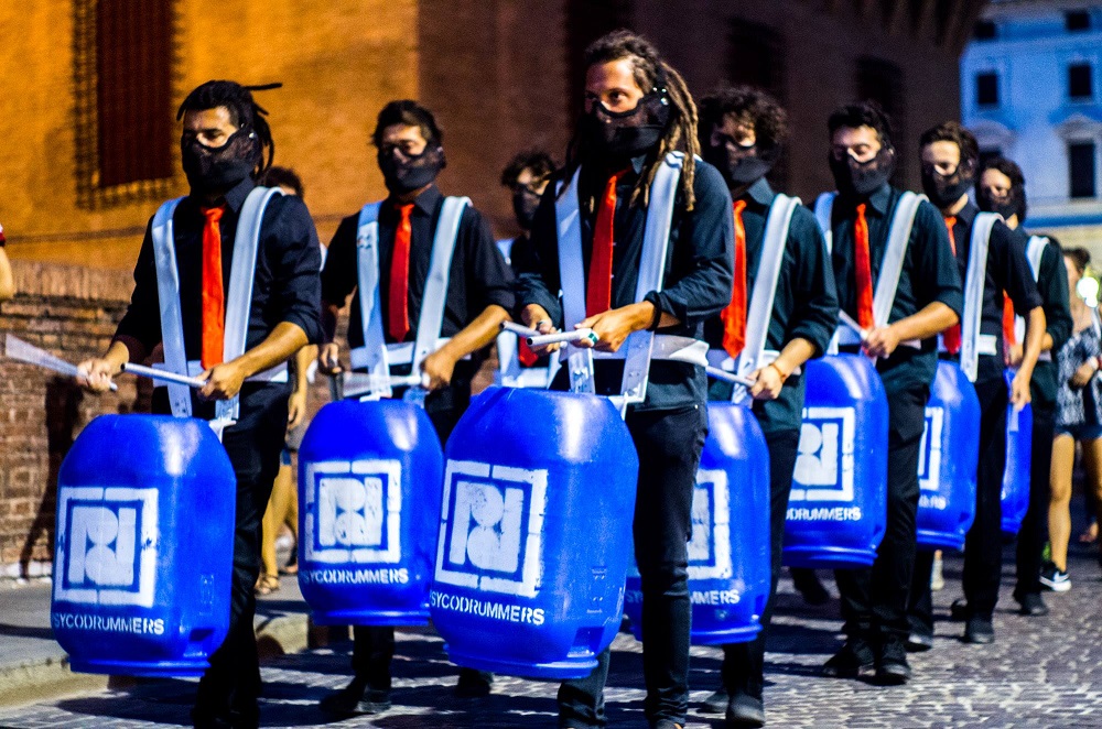 Chiuderà la serata la magia delle percussioni degli Psycodrummers, artisti di strada rodigini che sono assurti a livello nazionale grazie a uno studio costante. Gli strumenti che utilizzano sono fatti da loro: c’è anche l’arte del riciclo da parte degli Psyco. La maschera, che spesso indossano, è un elemento chiave. Vorrebbero che il pubblico imparasse ad amarli per le loro mani e i loro bidoni. Infatti indossano anche gli stessi costumi. Uniformarsi creando un unico meraviglioso suono: il loro.