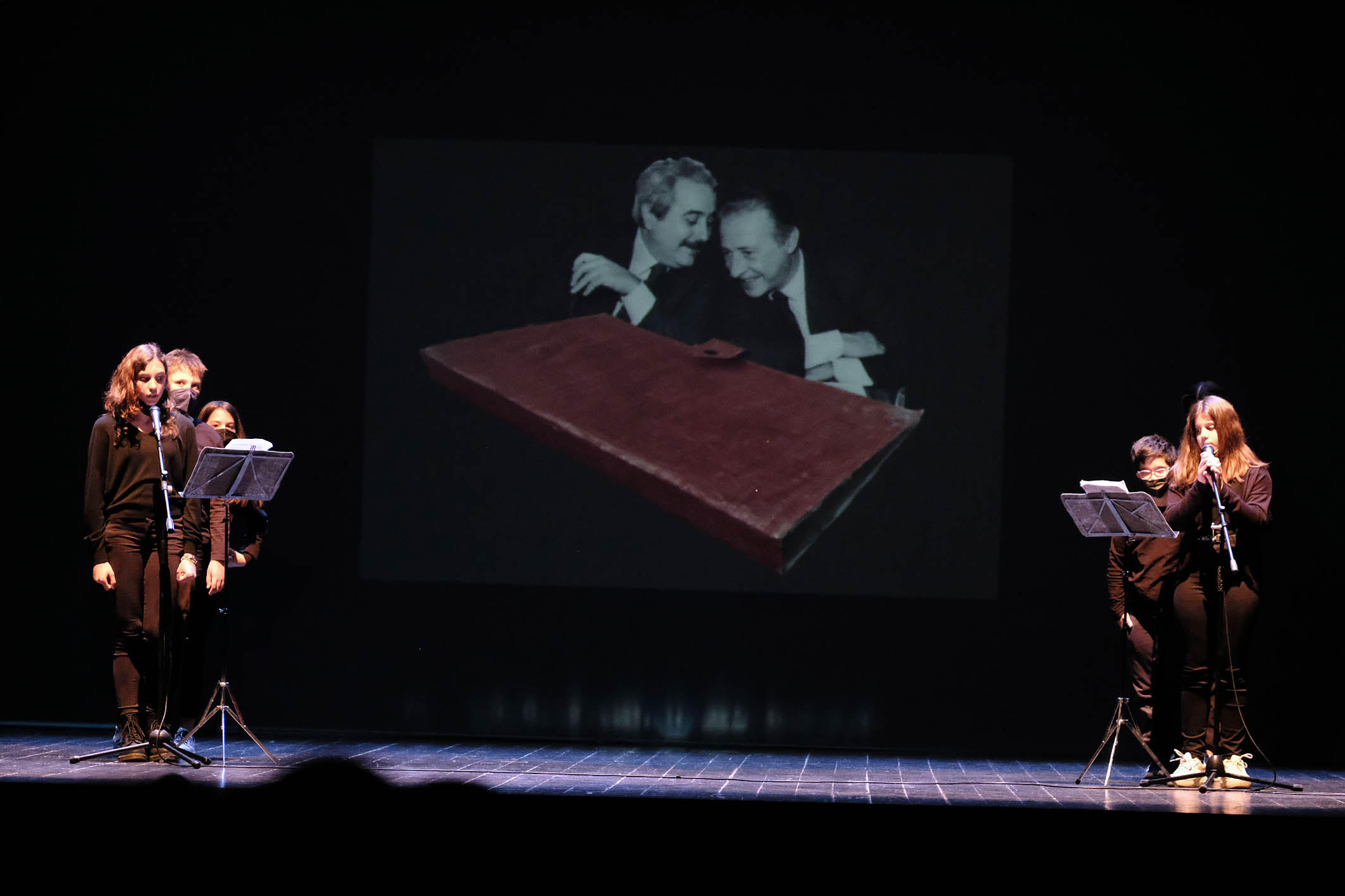 Poi, su una scenografia minimalista in bianco e nero, si sono intrecciate le letture dei ragazzi di seconda e terza media, impegnati a coinvolgere il pubblico su pensieri e riflessioni dure, da fare e da capire. “L’agenda rossa di Paolo Borsellino” prende le mosse dal taccuino scomparso del giudice saltato in aria con la sua scorta per opera della mafia, e si dipana attraverso “parole chiave”, come “ingiustizia”, “omertà”, “povertà”, che si articolano dalla definizione concettuale alla quotidianità. I pensieri possibili di Borsellino e dell’amico Giovanni Falcone, ucciso prima di lui dalla stessa mano, si confondono con quelli dei ragazzi sul proscenio. I testi sono degli stessi studenti. Per arrivare a quei livelli di concettualizzazione e di analisi, si intravvede veramente un lavoro lungo tutto un anno scolastico.