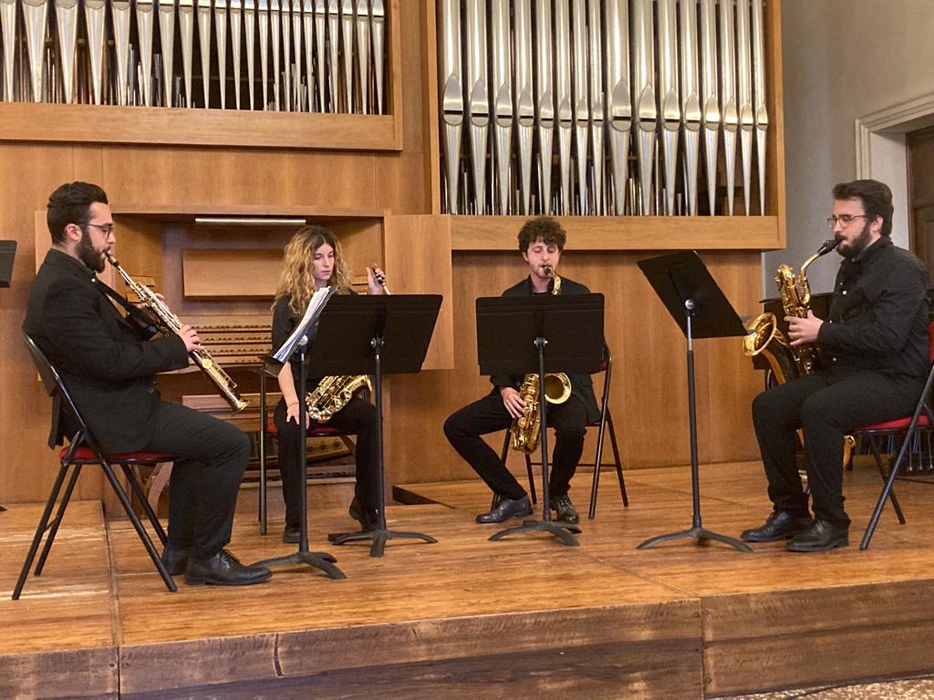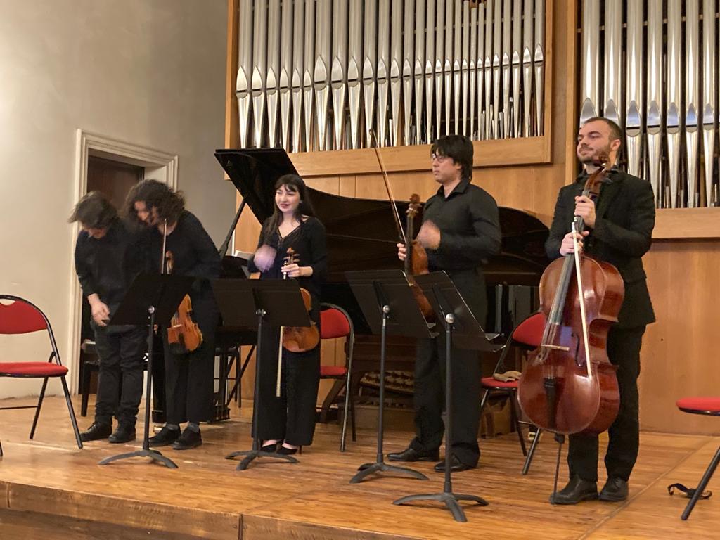 Tre i concerti anche nella settimana successiva: mercoledì 26 aprile a Palazzo Venezze un concerto di musiche del primo Ottocento con un virtuosistico Duetto per violoncello e contrabbasso di Domenico Dragonetti interpretato da Caterina Colelli e Paolo Iseppi, una sonata a quattro del dodicenne Rossini con Domenico Nicola Percetti e Federico Rossi violini, Nadia Ranallo violoncello e Alessandro Leone contrabbasso per concludere con l’imponente Quintetto di Borodin affidato a Sara Pini Ugolini e Lorenza Perrone violini, Li Xiaofang viola, Tiziano Guerzoni violoncello e Angelo Pastorini pianoforte. Giovedì 27 secondo appuntamento a Casa Romei con l’energico e appassionato Trio op. 63 di Schumann presentato da Simona Barberio violino, Jacopo Muratori violoncello e Angelo Pastorini e altri due lavori di Alfredo Casella: la drammatica Sonata a Tre op. 62 scritta nel 1938 interpretata con determinazione e coinvolgimento da Domenico Nicola Percetti violino, Luca Talassi violoncello, Marina Miani pianoforte e i piacevolissimi quattro Pezzi infantili nella trascrizione di David Vicentini per pianoforte a quattro mani, flauto, clarinetto e violoncello con Beatrice Bruscagin e Marina Miani, Camilla Masin, Matteo Brusaferro e Caterina Colelli. Venerdì 28 “ritorno” a Rovigo con tre gemme di Mozart, Reicha e Alessandrini per il trio di corni Elia Donegà, Christian Scalaprice e Gaia Capitani, due rare pagine per organo e corno di Bernhard Müller e Camille Saint-Saëns con Luca Fantato, Francesco Zaggia e Gaia Capitani e due coinvolgenti e impegnativi brani di recentissima composizione per saxofoni, Sarajevo di Guillermo Lago in ricordo della guerra in Bosnia e una suite di “questioni esistenziali” di Jun Nagao, nell’eccellente interpretazione del solidissimo quartetto formato da Alessandro Salaroli, Andrea Biasotto, Enrico Leonarduzzi e Riccardo Grubert.