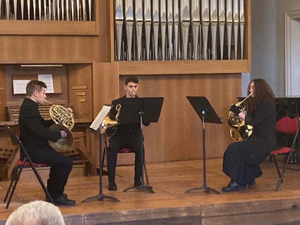 Il trio di corni con, da sinistra, Elia Donegà, Christian Scalaprice e Gaia Capitani,