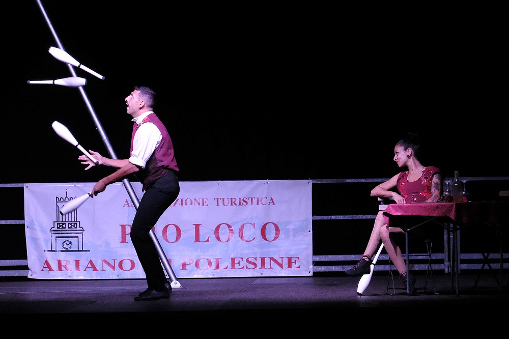 Ariano nel Polesine (RO) – Una serata con trecento presenze, record assoluto per la stagione estiva de “Il teatro siete Voi-Estate 2022”, che giovedì 4 agosto ha fatto tappa ad Ariano nel Polesine, come appuntamento della Fiera, in collaborazione con la Pro loco di Ariano. Per la prima volta in Polesine, il duo circense, Costanza Bernotti e Shay Wapniaz, lei trapezista di Riccione, lui giocoliere-equilibrista israeliano, coppia nello spettacolo e nella vita, che insieme formano il Circo bipolar, hanno allestito il loro magnifico show, “Cafè Rouge”.