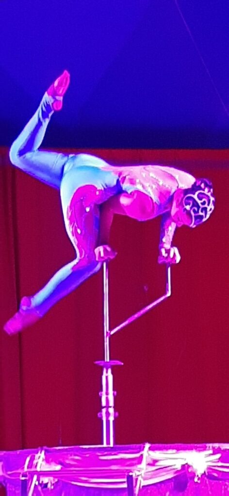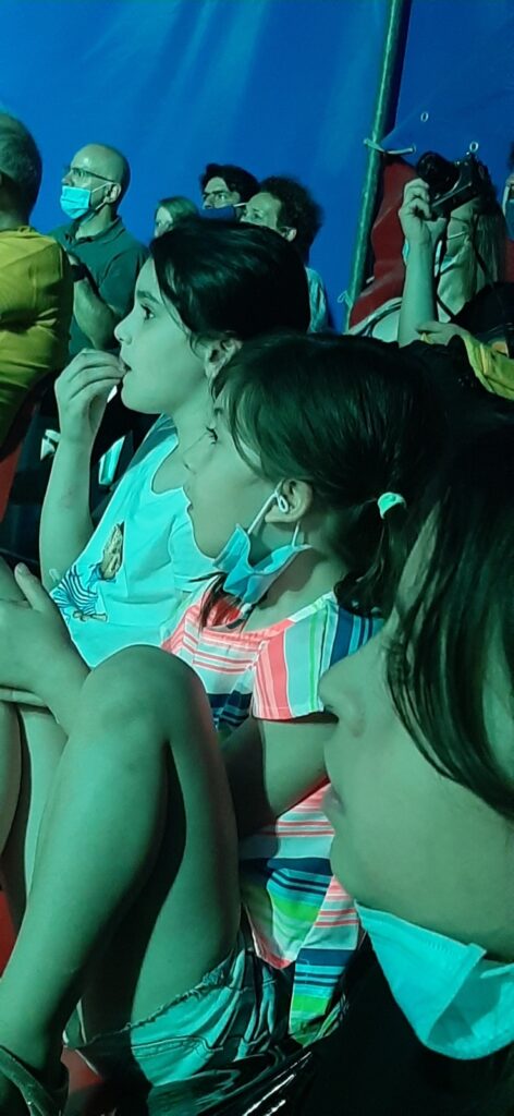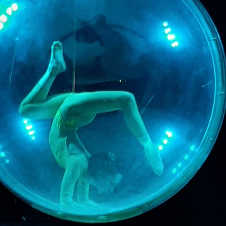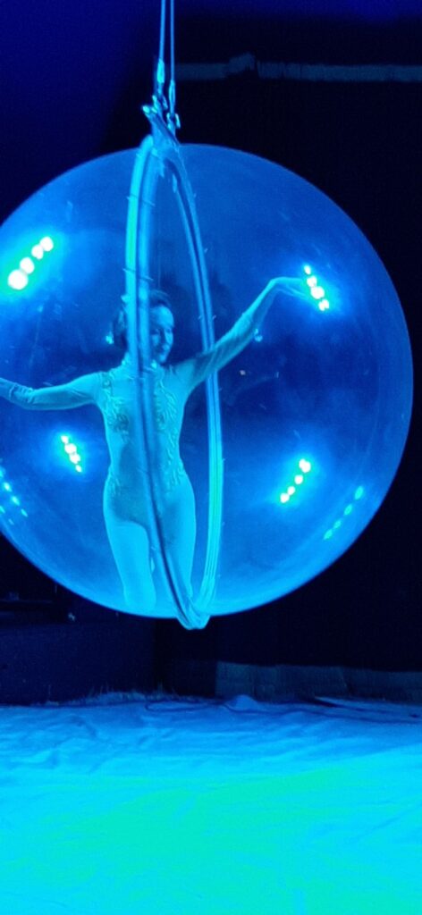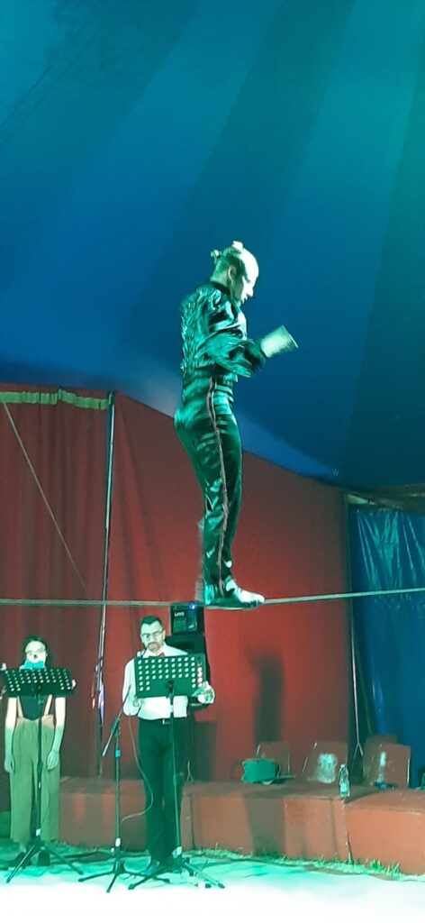 «Talvolta andiamo alla ricerca / e non sappiamo di cosa / finché non ritorniamo agli inizi» recita la poesia di apertura. Le note delicate dell’oboe di Marco Schiavon, che della serata è anche il regista, contribuiscono a creare l’atmosfera, già calda di un pubblico attento e partecipe, di tutte le età. Poi arrivano gli acrobati, sospesi, prima dentro a una palla trasparente, poi su di un filo. E da lì saltano, danzano, danno forma a figure suggestive che fanno eco alle parole dei testi di Lax.