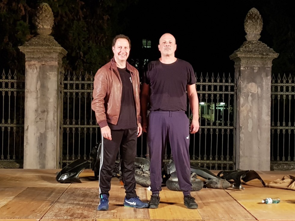 La scena – due corpi stesi a terra accanto ai motorini aggrovigliati come in una scultura deformata – diventa il microcosmo di un dialogo in cui ironia e cinismo si mescolano a momenti di verità amara. L’abilità di Torre sta nel far scaturire risate anche dal disagio, nel trasformare il realismo del linguaggio in una lente comica che non attenua, ma amplifica, la denuncia sociale. Castellani e Cioccolanti si muovono con straordinaria naturalezza in questo registro, restituendo al pubblico la sensazione di assistere a una conversazione “vera”, sporca di esitazioni, inflessioni e sarcasmo.