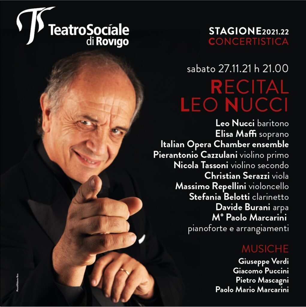 ROVIGO – La Stagione del Teatro Sociale di Rovigo prosegue, sabato 27 novembre alle 21 con un altro grande evento, il recital del baritono Leo Nucci assieme ad Elisa Maffi soprano e l’Italian Opera Chamber ensemble.