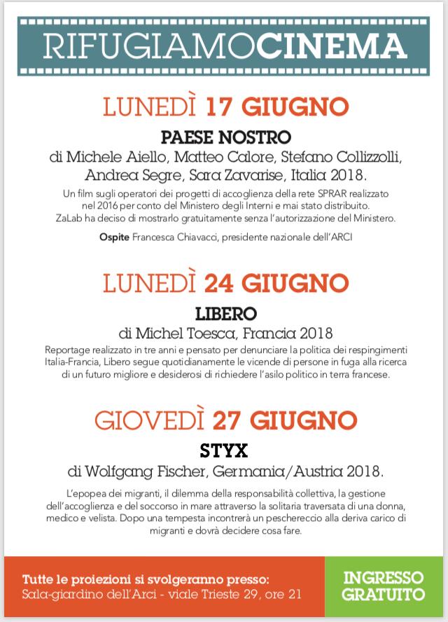 Prosegue il programma l’associazione Arcisolidarietà con “RifugiamoCinema”, una rassegna cinematografica ospitata nella sede di Arci di viale Trieste 29. Questi i titoli in programma: lunedì 17 viene proiettato “Paese nostro”, film realizzato nel 2016 da ZaLab per conto del Ministero degli Interni, ma che non era fin’ora stato distribuito. Lunedì 24 è la volta di “Libero” di M. Toesca, film che segue le vicende di un agricoltore francese che ha deciso di aiutare i migranti che tentano senza successo di valicare il confine alpino. Chiude la rassegna giovedì 27 “Styx” di W. Fischer. Tutte le proiezioni di RifugiamoCinema iniziano alle ore 21 e sono gratuite.