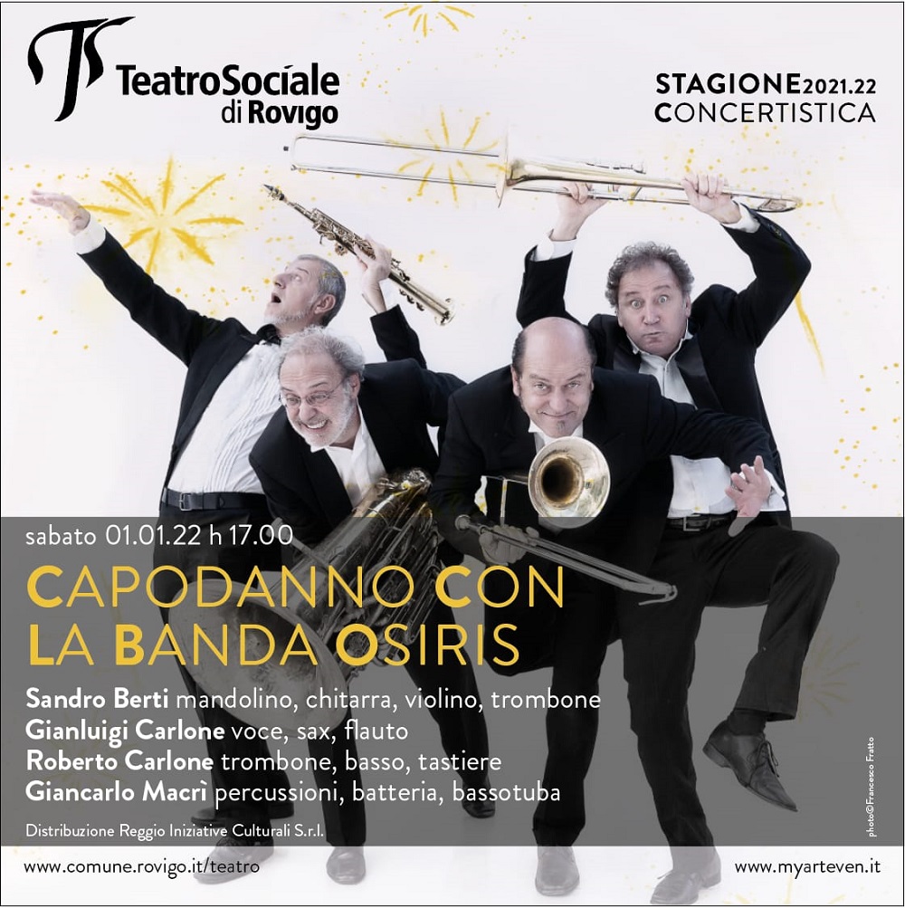 ROVIGO – Sarà la Banda Osiris a salutare il nuovo anno. Sabato 1 gennaio alle 17 al Teatro Sociale di Rovigo, protagonista sarà l’allegria di questa famosa irriverente Banda formata da: Sandro Berti (mandolino, chitarra, violino, trombone); Gianluigi Carlone (voce, sax flauto); Roberto Carlone (trombone, basso, tastiere); Giancarlo Macrì (percussioni, batteria, bassotuba).