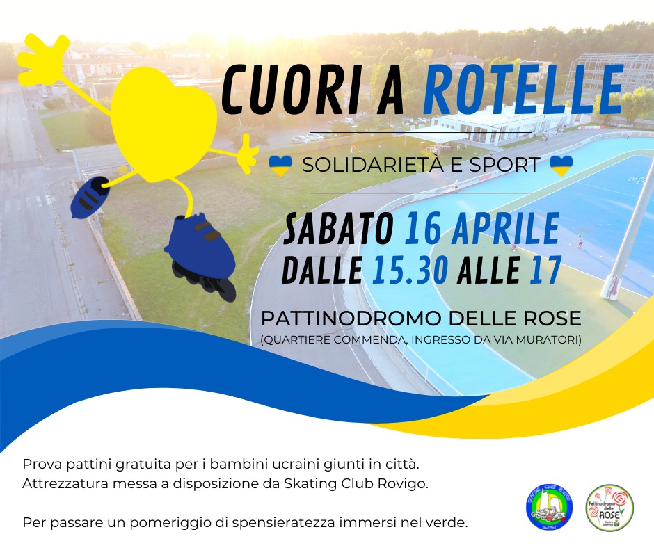 Al pattinodromo delle rose, sabato 16 aprile, dalle 15.30 alle 17, solidarietà e sport con “Cuori a rotelle”. Prova pattini gratuita per i bambini ucraini giunti in città. L’attrezzatura verrà messa a disposizione dallo Skating Club Rovigo.