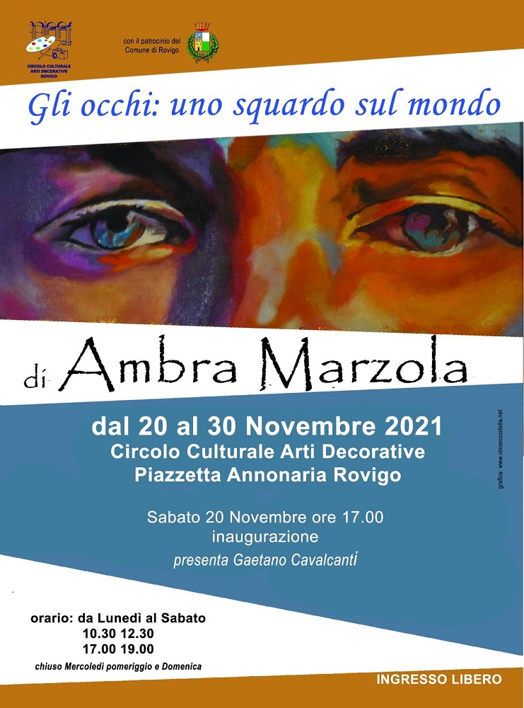 Inizia il pomeriggio di sabato 20 novembre alle ore 17.00, Ambra Marzola con la presentazione della sua mostra di pittura dal titolo “Gli occhi. uno sguardo sul mondo ” a cura dell’amico pittore Gaetano Cavalcanti.