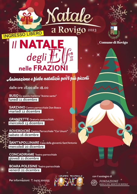 ROVIGO – Ritorna “Il Natale degli Elfi nelle frazioni” di Rovigo. La manifestazione è ideata, progettata ed organizzata per il quinto anno dal Gruppo Teatrale “Il Mosaico” con il sostegno del Comune di Rovigo – Assessorato agli Eventi e la Fondazione Banca del Monte di Rovigo.