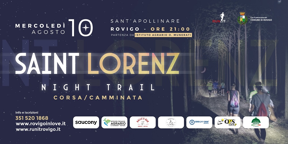 ROVIGO – Mercoledì 10 agosto tutti di corsa con la Saint Lorenz Night Trail. Si tratta di una corsa/camminata amatoriale organizzata da ASD Run It, che quest’anno regalerà ai partecipanti due percorsi di 6 e 10 km ancora più belli. Da un lato si potrà camminare guardando le stelle, dall’altro vedere i luoghi veramente suggestivi di Sant’Apollinare frazione ricca di attrazioni sportive, paesaggistiche e culturali.