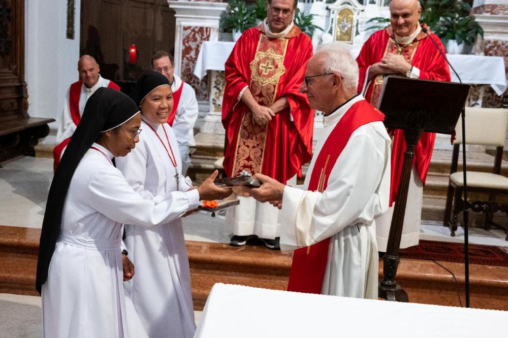 Un momento particolarmente sentito è stato il saluto e il ringraziamento ufficiale a suor Maria Goretti e alle consorelle della congregazione delle Ancelle Parrocchiali dello Spirito Santo, presenti a Porto Viro dal 2006 su invito dell’allora parroco don Sergio Bergamo. Seguendo il carisma della fondatrice Madre Giuditta Martelli, le religiose hanno offerto alla comunità quasi vent’anni di servizio generoso nella catechesi, nell’animazione liturgica, nell’accompagnamento dei gruppi di preghiera e nella visita a malati e anziani, diventando un autentico punto di riferimento pastorale e umano.