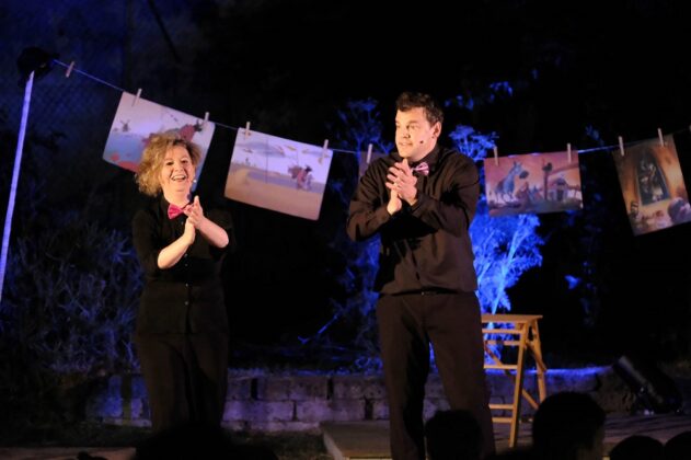 “I musicanti di Brema”, ispirato alla fiaba dei Grimm, è un classico per i più piccoli della Barabao a movement theatre company di Padova. Scritto ed interpretato “rumorosamente” dai meravigliosi Romina Ranzato e Ivan Di Noia, lui un rumorista da sbalordimento. E proprio i suoni e i rumori hanno una parte centrale in questo racconto, dove i due attori appaiono sia in veste di narratori che di interpreti dei personaggi. L’asino, il cane, la gattina ed il gallo, i quattro musicanti diretti a Brema, vengono caratterizzati ciascuno con una diversa cadenza dialettale decisa e suonano degli strumenti musicali sempre grazie al Di Noia. Così l’asino capobanda è un veneto che suona la “bataria”, il cane è di Trapani con il maranzano, la gattina una rockettara da chitarra elettrica a rif di Jimi Hendrix ed il gallo canta Riccardo Cocciante. I quattro si rimbeccano con battute e gag nel cammino fino a Brema.