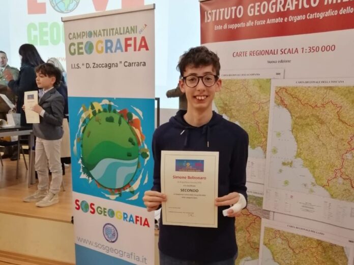 «L’interesse per la geografia – il commento di Simone – mi è stato trasmesso da mio papà, perché anche lui è da sempre appassionato a questa materia. Fin da quando ero piccolo, guardavamo le cartine geografiche e sfogliavamo l’atlante sfidandoci a vicenda su capitali e bandiere facendo a gara a chi ne riconosceva di più. La geografia secondo la mia opinione è una materia vasta che si collega a molte altre discipline e ha sempre stimolato la mia curiosità e la mia voglia di conoscere. Questa passione è continuata alle scuole medie, quando la mia professoressa di geografia, accortasi del mio interesse, mi ha proposto di partecipare ai campionati nazionali di geografia per studenti delle scuole medie. Quest’anno, non potendo partecipare alla sezione dedicata agli studenti delle scuole superiori perché ero in gita, mi sono iscritto alla categoria Open aperta a tutte le età. Al di là di ogni aspettativa, mi sono classificato secondo alle spalle di un prof. di geografia. La premiazione si è svolta a Carrara, in Toscana e in quell’occasione ho scoperto che il primo classificato rinunciava al premio (un soggiorno di tre giorni nell’Appennino tosco-emiliano) cedendolo a me. Avrò così l’occasione di visitare il parco accompagnato da una guida naturalistica. La prova era strutturata in trecento domande totali suddivise in 10 blocchi da 30 domande ciascuno riguardanti tanti temi, tra cui Geografia umana, carte, coordinate geografiche, luoghi, ambiente ed energia, geopolitica, diritti umani, storia delle esplorazioni, bandiere».