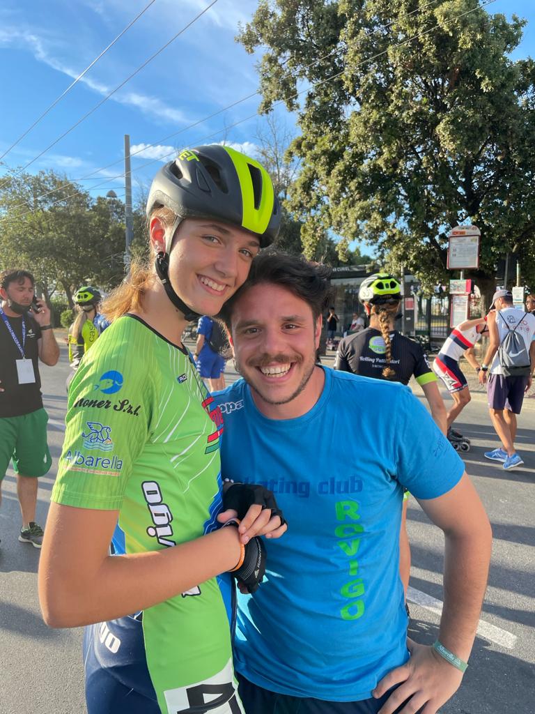 Grande risultato per Emma Trovò (Allievi), quinta nei 100 metri in corsia anche se con secondo tempo nei quarti di finale ma purtroppo ad eliminazione diretta, che ha gareggiato con la compagna di squadra Irene Bragioto, atleta in costante crescita, coppia altamente performante giunta quinta nella team sprint su ben 56 team partecipanti. Ottima prestazione anche per Elisa Berto (Junior), qualificata anche lei ai quarti dei 100 metri, sesta in classifica finale, atleta che ha corso la team sprint con la portabandiera Benedetta Rossini (Senior), quest’ultima ancora una delle migliori pattinatrici d’Italia, con il quinto risultato nel 400 metri sprint. Chiude lo schieramento Filippo Santato, che oltre alle gare di cartello ha partecipato poi alla maratona, 42 km in un circuito cittadino con traguardo in viale Ceccarini.