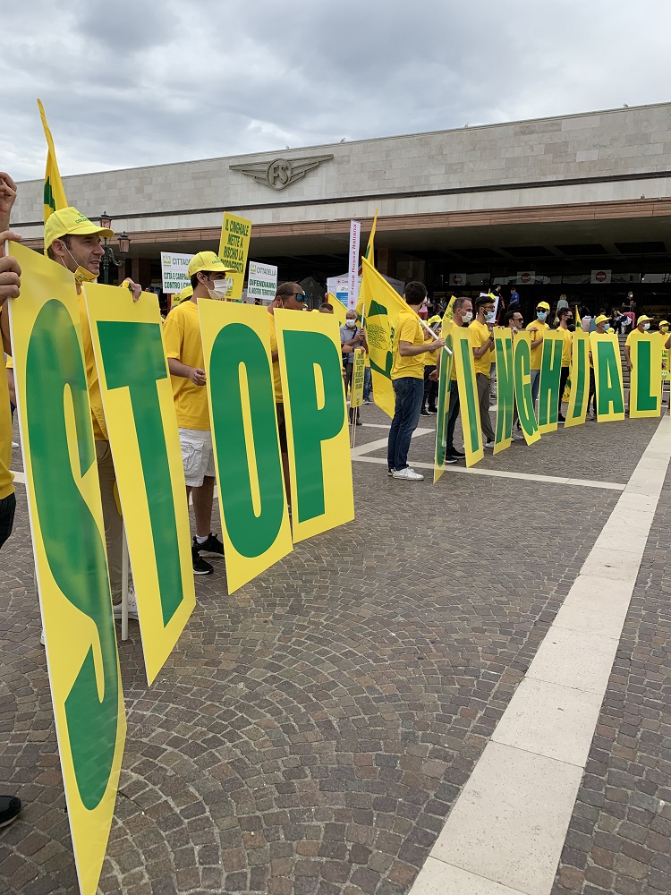 Coldiretti Rovigo, con soci e dirigenti, ha raggiunto piazzale Santa Lucia muniti di bandiere e cartelli, assieme ai colleghi di tutte le federazioni venete. È stato un grande flash mob “silente” per testimoniare lo stato in cui gli operatori agricoli e i cittadini sono costretti ad affrontare l’invasione dei cinghiali dalle campagne alle città. Il fenomeno che lascia tutti “senza parole” è stato spiegato attraverso l’esposizione “muta” di grandi immagini con ritratti ettari di mais devastati, foto di incidenti stradali e di cinghiali che scorrazzano indisturbati nei centri residenziali, rovistando tra i cassonetti di rifiuti a ridosso delle abitazioni. Una situazione fuori controllo favorita dall’emergenza Covid che con il lockdown ha lasciato campo libero a intere colonie che dagli spazi rurali si sono spinti fino alle aree urbane  arrivando sempre più vicini alle famiglie, nei parchi dove giocano i bambini o alle scuole. Gli animali selvatici distruggono produzioni alimentari, sterminano raccolti, assediano campi: non più di tanto possono fare i circa 7mila selecontrollori. Il dossier elaborato da Coldiretti evidenzia danni periziati per oltre un milione di euro di cui liquidati poco più della metà.