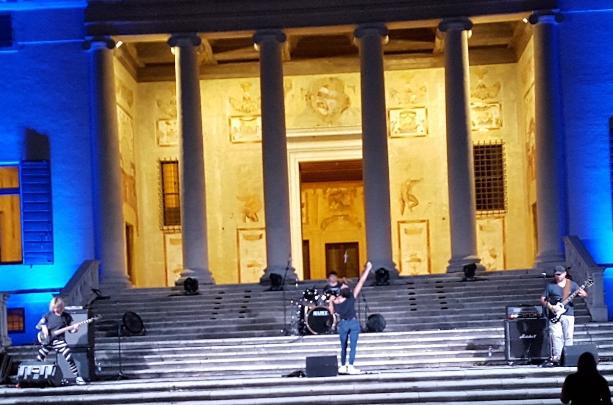La serata si è riscaldata poi con la voce di Katrin Roselli, giovane artista rodigina, con già un curriculum importante: dal Festival Show a finalista a Sanremo Young, senza trascurare le diverse esperienze all’estero. Ha proposto cover di vari artisti nazionali ed internazionali, fra cui Ariana Grande, Annalisa, Lady Gaga e Caterina Caselli. La serata è poi proseguita con l’Hard Rock dei FitOn Falls, gruppo di quattro giovani ragazzi polesani, formato da Roberta Padoan (voce), Michele Bellinello (basso), Marco Fioratti (batteria), Riccardo Bisson (chitarra). Nel finale, con la musica dei Led Zeppelin, i fans si sono avvicinati sotto la scalinata a sostenere i propri beniamini.