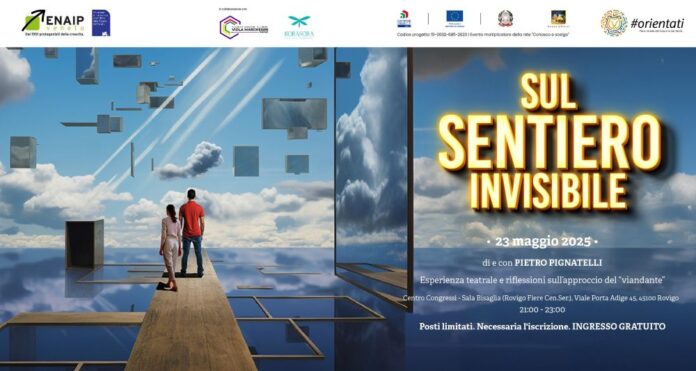 ROVIGO – “Sul sentiero invisibile” è il titolo dello spettacolo scritto e condotto dall’attore Pietro Pignatelli rivolto alle famiglie e a tutta la comunità educante impegnata nel difficile compito di sostenere i ragazzi nelle prime scelte importanti della loro vita. L’evento, promosso e organizzato dall’Enaip del Veneto, dalla Rete per l’Orientamento della Bassa Padovana in collaborazione con il Viola-Marchesini capofila della rete per l’orientamento della provincia di Rovigo, si svolgerà venerdì 23 maggio prossimo a partire dalle 21 presso la sala Bisaglia del Censer ed è ad ingresso gratuito.