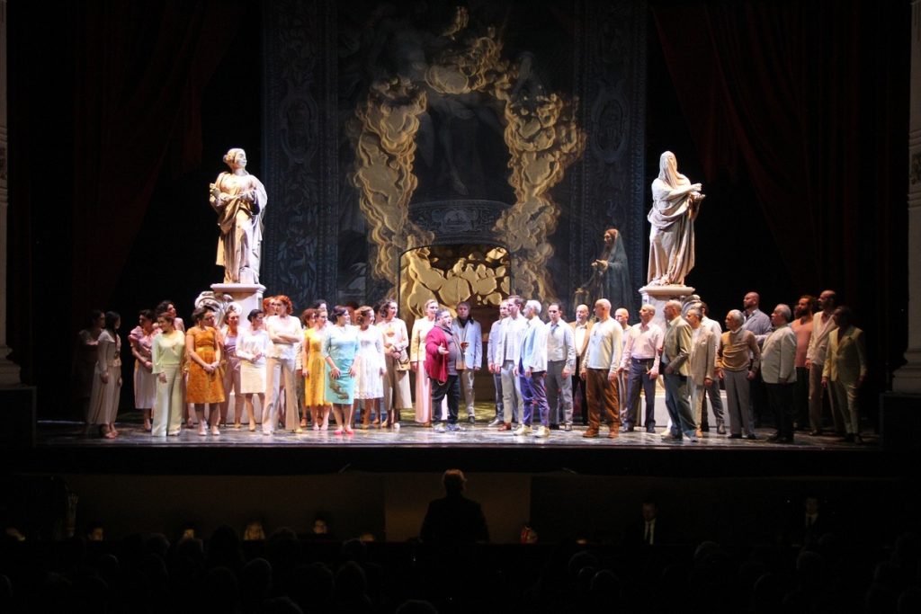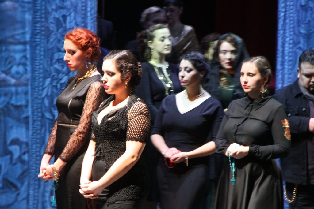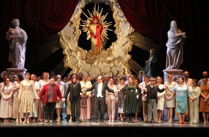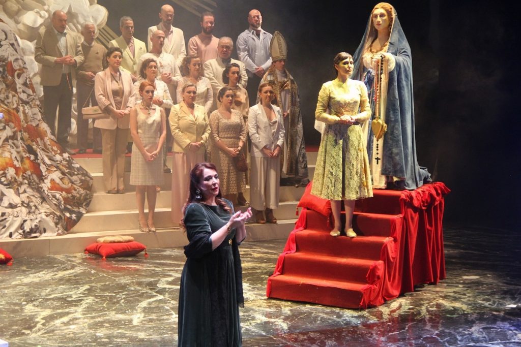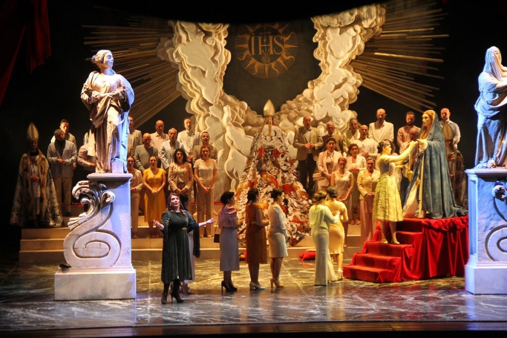 Suor Angelica e Cavalleria Rusticana diventano quindi un’opera sola che – nello sfondo di una terra intrisa di religiosità cattolica che non di rado sfocia nella superstizione – narra la storia di figli strappati alle madri e poi uccisi (davvero o per finta) e di madri che si piegano al volere di donne più forti. Una storia forte che costringerà a porsi domande anche nei giorni successivi.