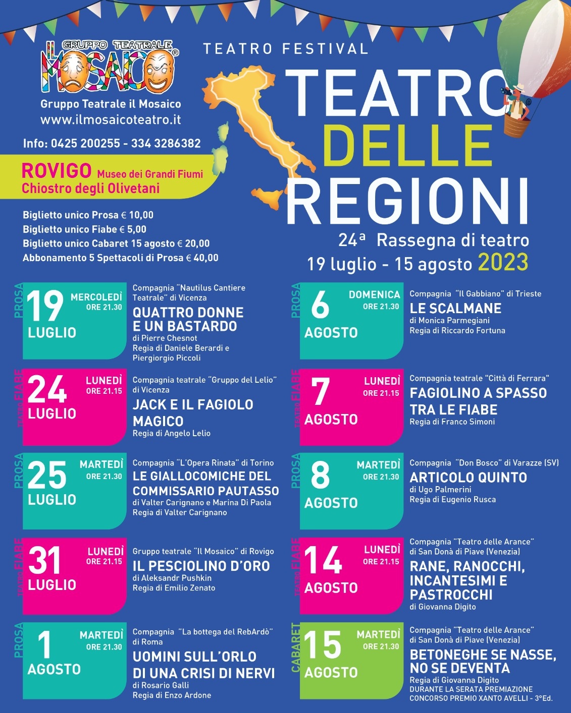 Il festival Teatro delle Regioni è organizzato dal Gruppo Teatrale Il Mosaico di Rovigo, con il sostegno di: Regione Veneto, Comune di Rovigo, Fondazione Banca del Monte di Rovigo, Fondazione Rovigo Cultura e Banca del Veneto Centrale. La manifestazione si avvale del patrocinio della FITA nazionale e della Provincia di Rovigo. Mediapartner e partner: Radio Rovigo, Museo dei grandi fiumi, AP&P Srl, Casa del pollo, Panificio al forno Lunardi.