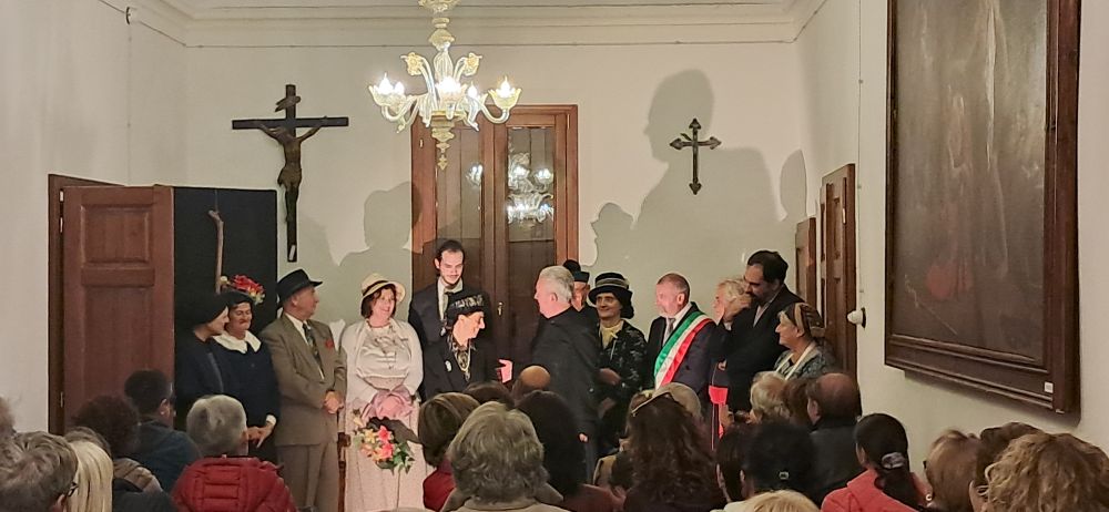 Al termine, l’archivio al piano terra – con i suoi armadi ricolmi di carte – ha accolto un conviviale rinfresco e soprattutto i racconti del custode del Museo, Luigi Dentello, che ha accompagnato gli spettatori in un viaggio tra aneddoti e curiosità. Grazie alla disponibilità dell’amministrazione comunale, la serata ha offerto anche un suggestivo momento di rievocazione: il presidente di FITA Rovigo, Maurizio Noce, ha letto il testo dell’editto con cui nel 1806 Napoleone privò della cittadinanza i residenti di Crespino. Un gesto simbolico che ha collegato il piacere del teatro all’avvio delle Giornate della Carboneria, cui partecipa anche il Comune di Crespino.