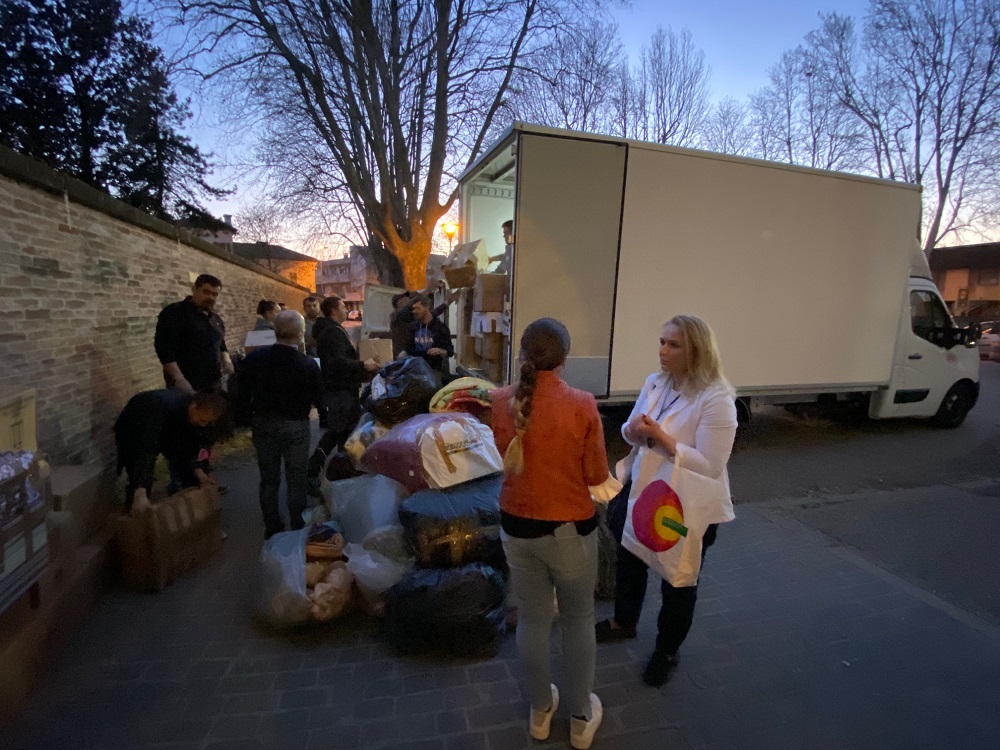 Ogni giorno è una processione di auto che si avvicendano nel piazzale della chiesa per lasciare il proprio contributo nei cestoni color verde con il cartello “donazioni per l’Ucraina”, collocati sul sagrato, oppure per raggiungere il punto di raccolta nel chiostro del Monastero degli Olivetani, che per tutta la giornata risulta animato dall’operosa presenza dei tanti volontari italiani e ucraini.