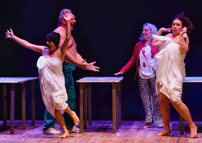 In effetti i protagonisti della commedia sono morti e sono tante le risate che gli stessi suscitano con le loro battute e le loro situazioni paradossali. I cinque personaggi di questa divertentissima e originale commedia di Gianni Clementi sono, in effetti, dei morti “molto vivaci” e molto attivi, oltre a rappresentare una umanità particolarmente eterogenea. Rappresentano realtà che difficilmente avrebbero potuto amichevolmente “interagire” in vita… loro però non si incontrano in vita, ma in un obitorio… e sono coperti da lenzuola bianche.
