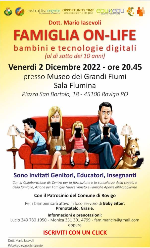 Si parlerà di tutto questo, di relazioni educanti, di esperienze, di confini e di regole, nell’incontro dal titolo “Famiglie on Life” organizzato dal Movimento Famiglie Nuove, in collaborazione con il Consultorio Familiare Socio Educativo e con l’associazione Famiglie aperte all’accoglienza, venerdì 2 dicembre dalle 20.45, presso la sala Flumina del Museo dei Grandi Fiumi a Rovigo.