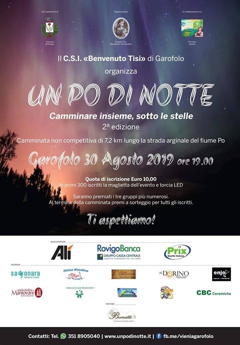 Garofolo di Canaro (RO) – Si svolgerà venerdì 30 agosto la seconda edizione di “Un Po di Notte – Camminare insieme, sotto le stelle”, la manifestazione podistica promossa dal Circolo CSI “Benvenuto Tisi” di Garofolo, con la collaborazione della Pro Loco di Canaro e il patrocinio dell’amministrazione comunale.