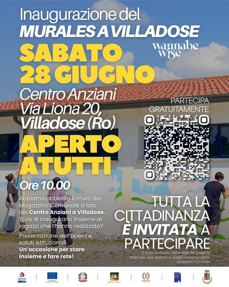 Villadose (RO) – Si terrà sabato 28 giugno, l’inaugurazione pubblica del murale realizzato da un gruppo di giovani del Comune di Villadose, nell’ambito del progetto “Wannabe Wise – Giovani in Viaggio”, che vede Assistedil capofila sul territorio provinciale di Rovigo.